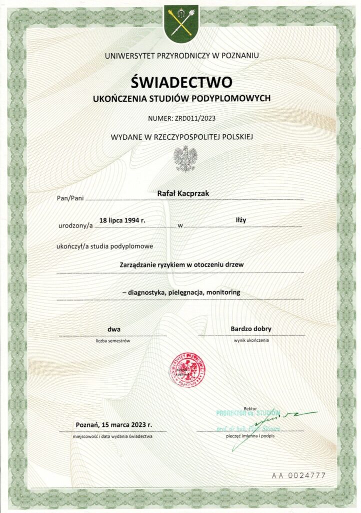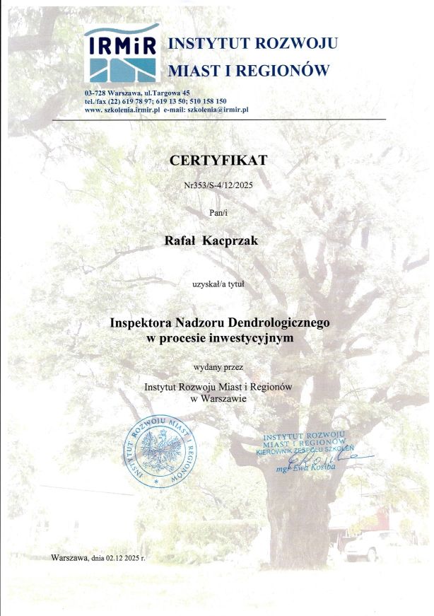 Ukończyłem studia podyplomowe z zakresu zarządzania ryzykiem w otoczeniu drzew, co pozwala mi kompleksowo analizować bezpieczeństwo oraz oddziaływanie drzew na infrastrukturę i przestrzeń publiczną. Posiadam certyfikat Inspektora Drzew oraz certyfikat Inspektora Nadzoru Dendrologicznego w procesach inwestycyjnych.