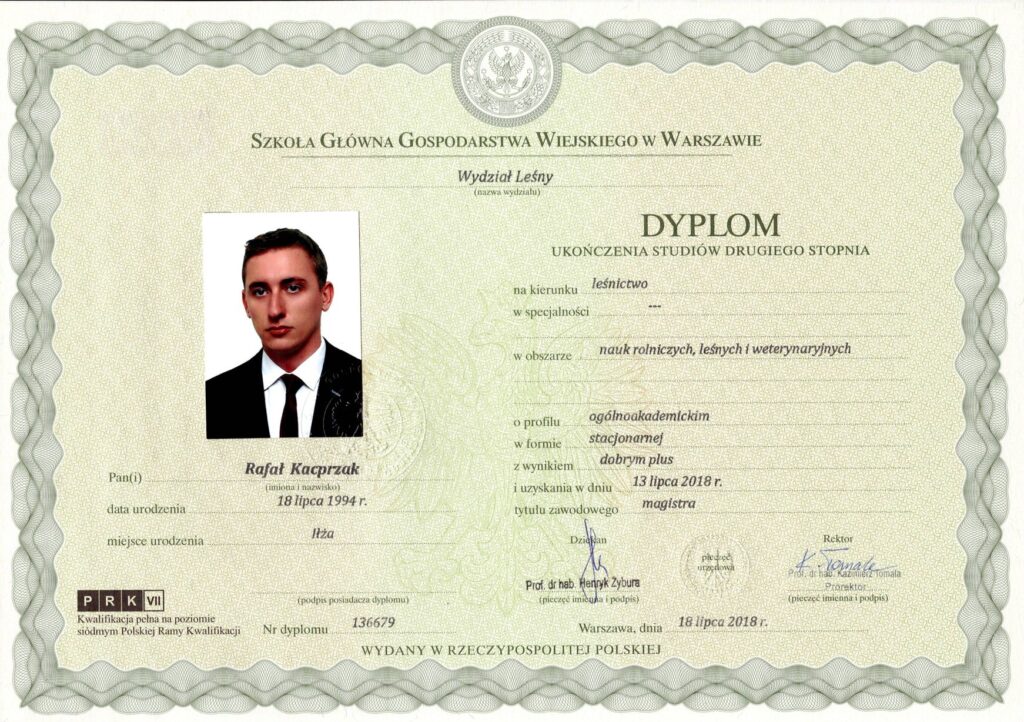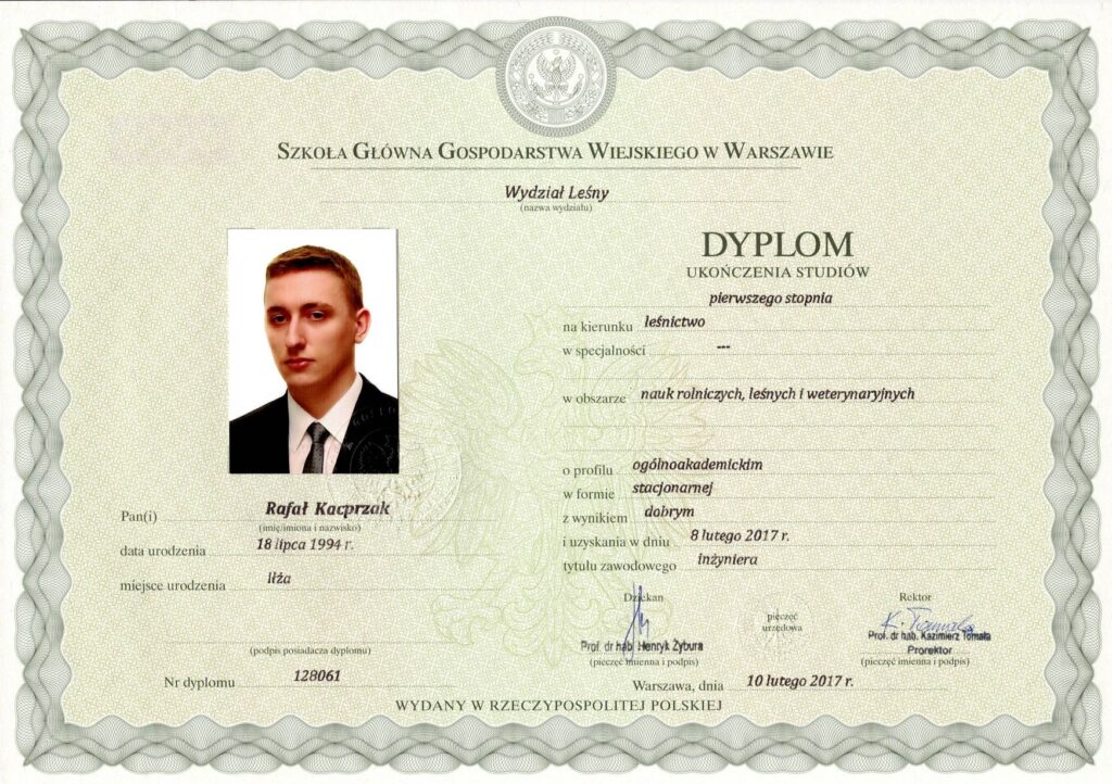 Jestem inżynierem oraz magistrem leśnictwa, specjalizującym się w inwentaryzacji drzew oraz ocenie ich stanu zachowania. Posiadam wykształcenie kierunkowe oraz kwalifikacje potwierdzone certyfikatami branżowymi.